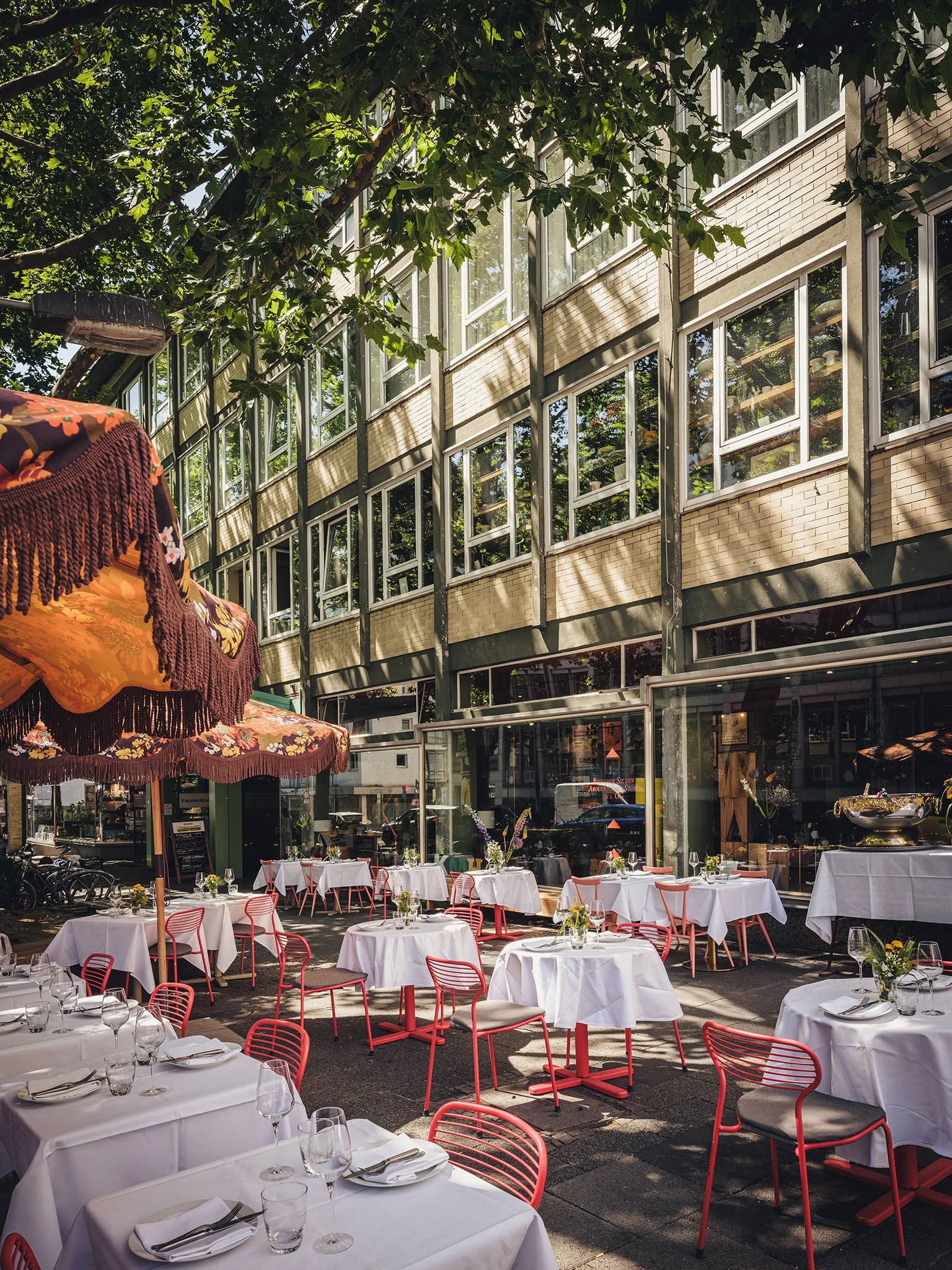 Die schweren Sonnenschirme spenden Schatten, während das Glas klirrt und frische Blumen auf weißen Tischdecken leuchten. Ein Ort zum Ankommen, Bleiben und Genießen – mitten in Frankfurt, mitten im Jetzt.